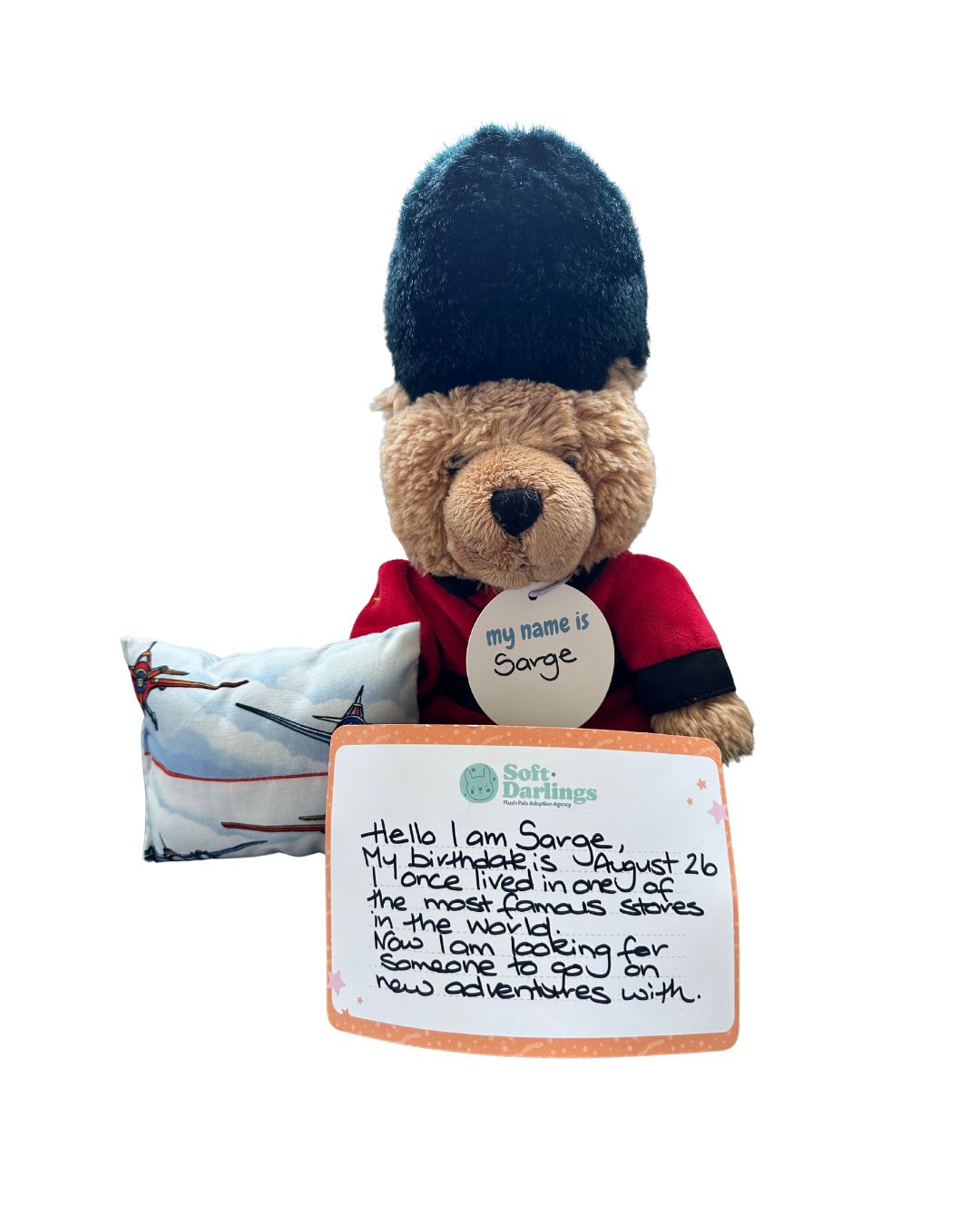 Say hello to Sarge, one of our newest arrivals at the Soft Darlings Plush Pal Adoption Agency — sweet, snuggly, and officially ready to find their forever home.