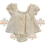 Soft, delicate and beautifully detailed 🤍 This Little Peachy beige cotton dress features built-in bloomers for easy, all-in-one wear. Finished with the sweetest lace trim across the top, it’s breathable, timeless and perfect for special moments or everyday elegance. A boutique piece that feels extra special without trying too hard.